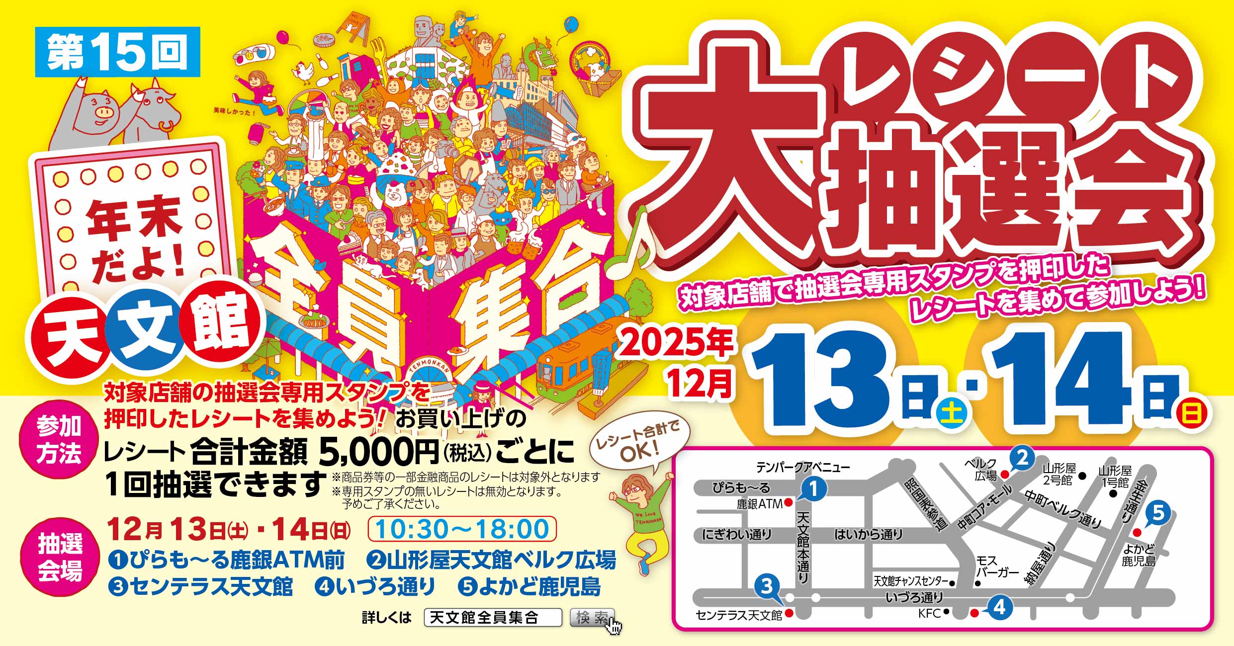 天文館の対象店舗で期間中にお買い上げのレシート合計金額5000円(税込)ごとに1回抽選できます。